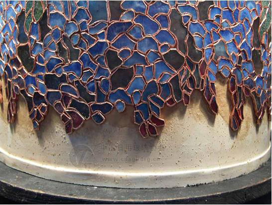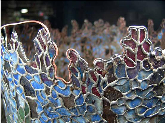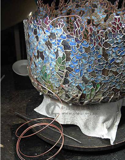 第五步,在灯模外涂上一层比较薄的黄蜡,把玻璃和铜丝同时镶嵌在上边,类似于中国传统艺术景泰蓝的制作工艺。当所有的玻璃碎片就位后就开始焊接铜丝,焊接前尽量让铜丝的符合玻璃碎片的弧度,保持紧贴。