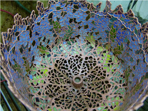 第四步,制作铜骨架,把拼好的玻璃里碎片摆放在灯的模具上。然后将铜丝弯曲成适合玻璃片的形状,把玻璃片镶嵌在已经弯曲好的铜丝中。