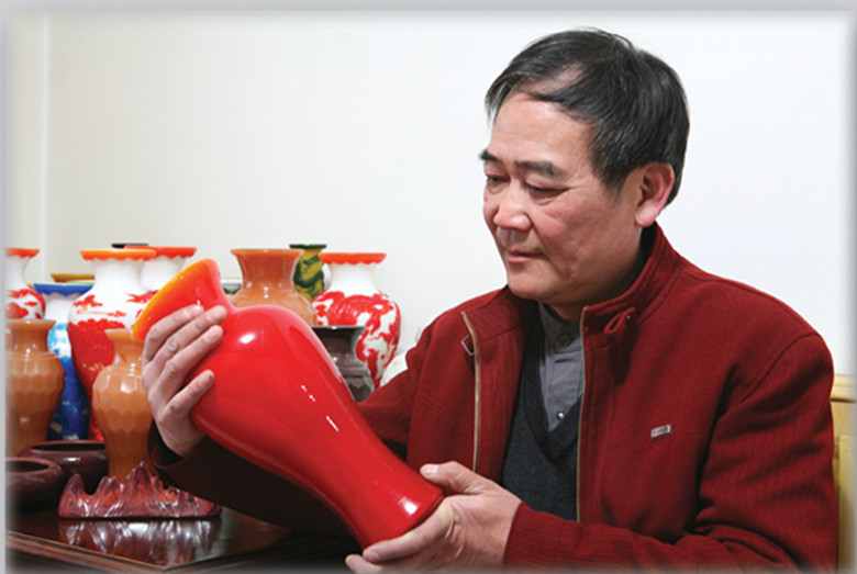 其研制的鸡肝石瓶,色如鸡肝,纹如佳石,斑纹如重峦叠嶂,浑然天趣,气象万千;松石绿、祖母绿瓶温重可爱,使名贵色料重现于世;粉红玉瓶晶莹剔透,可与天然玉石相媲美,是世界收藏之上品。各种手工吹制的套料瓶、料器、文房四宝等,经雕刻后更显其古朴凝重、典雅大方、细腻雅致的艺术风格,深受国内外收藏家的青睐。其创作的琉璃雕刻《龙凤呈祥》花瓶、帽筒在山东省第二届工艺美术精品集家居用品博览会上获得2010年“神龙杯”山东省工艺精品银奖,《龙凤呈祥》坛子获2010年第六届中国水晶及玻璃制品博览会创意精品大奖赛优胜奖。