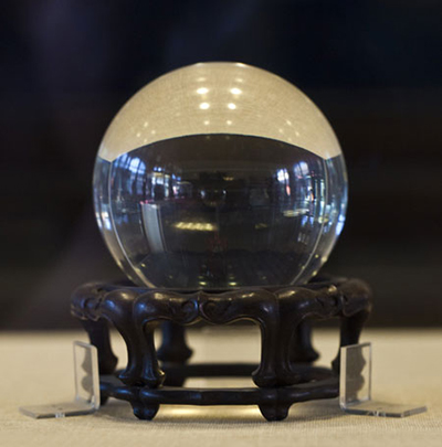为什么说这个水晶球产地是中国东海呢?严奉林先生对该水晶球进行了考证:其一,水晶球是在中国加工制作的。展品说明上清楚注明,这个水晶球是1923-1924年在中国加工制作的。在当时没有先进的切磨工具与材料的情况下,加工这样大的水晶球其难度与风险之大,是可想而知的。但由于中国在加工珠宝玉石球工艺方面,已有数千年的历史,积累了丰富的经验,所以敢于加工。同时也体现了中国人的智慧与聪明。其二,加工制作大水晶球的原石很可能是来自中国江苏东海县清朝宣统年间失踪的那块大水晶石。
