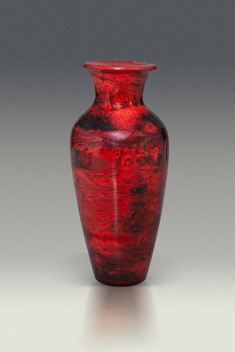 鸡肝石料,早年称作“鸡肝色”,顾名思义,这是一种色如鸡肝纹似佳石的色料。其中黑色纹理或如重峦迭嶂,云影水涣,或如老树奇石,芊草繁花,浑然天趣,气象万千。用此色料制成的笔筒、笔洗、卷筒、笔山、镇纸等成套文具和花瓶,酒杯等器皿,古朴凝重、典雅大方。此料虽非十分名贵,然其工艺难于掌握,其中呈现的纹理不可预期,只能于偶然中得之,故其中精晶并不易得。民国初年,博山和成炉曾生产了大批的鸡肝石花瓶,笔筒、茶杯、酒杯等。偏偏各料货庄都不认货,无人问津,全堆在炉主屋后的夹道内。后来有个日本人来到博山,发现了这批产品,惊喜不已,如获至宝,遂全部买去,并预订了一大批货,从此,鸡肝石料产品销路大开,随做随卖。近年,博山美术琉璃厂也曾大量生产过鸡肝石产品,以花瓶和成套文具为主,主要销售对象仍是日本人。