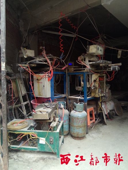 在上冲社区一宝石加工作坊内,一堆宝石加工机被杂乱地堆砌在屋内,存在安全隐患,执法人员要求作坊负责人及时清理撤离。 本报记者 黄颖盈/摄