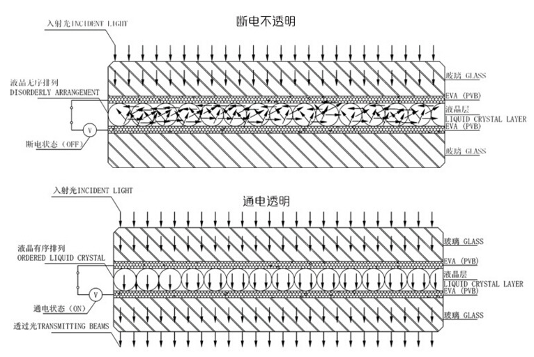 通过调光玻璃生产工艺图1以及调光玻璃结构原理示意图2,可以看出调光玻璃的加工工艺与夹胶玻璃相类似,同样属于夹层玻璃中的一种。