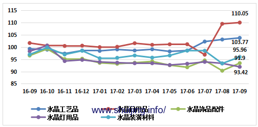9月水晶产品二级分类价格指数互有涨跌,除水晶灯用品价格指数下跌,其余四类价格指数均有上涨。其中,水晶饰品配件和水晶装潢材料9月价格指数上涨幅度较大,分别环比上涨3.34%,2.86%;水晶工艺品和水晶日用品9月价格指数小幅上涨,分别环比上涨0.64%,0.47%;水晶灯用品9月价格指数环比下跌1.45个百分点,跌幅1.55%。在五大类水晶产品价格的综合影响下,9月水晶产品价格指数稳中趋升。
