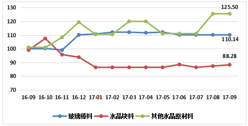 在水晶原材料三个大类中,9月玻璃棒料和其他水晶原材料价格指数与上期持平,水晶块料价格指数略有上涨。9月水晶块料价格指数收报于88.28点,环比微涨0.93点,从而带动总的水晶原材料价格小幅上涨。
